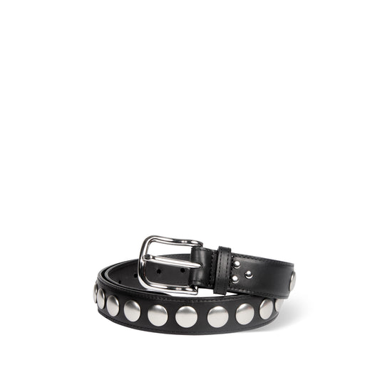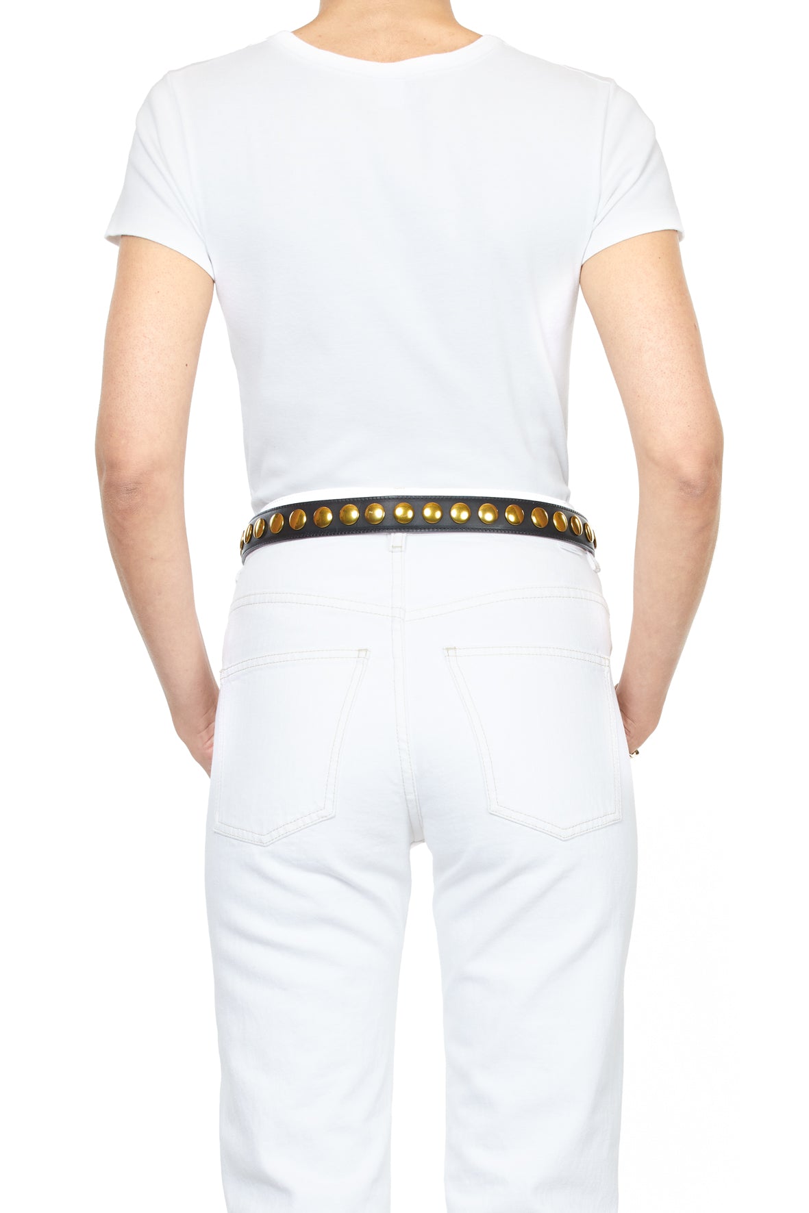 Mit großen gewölbten Metallnieten verziert. Verstellbarer Gürtel. Auf der Hüfte oder High Waste zu tragen.