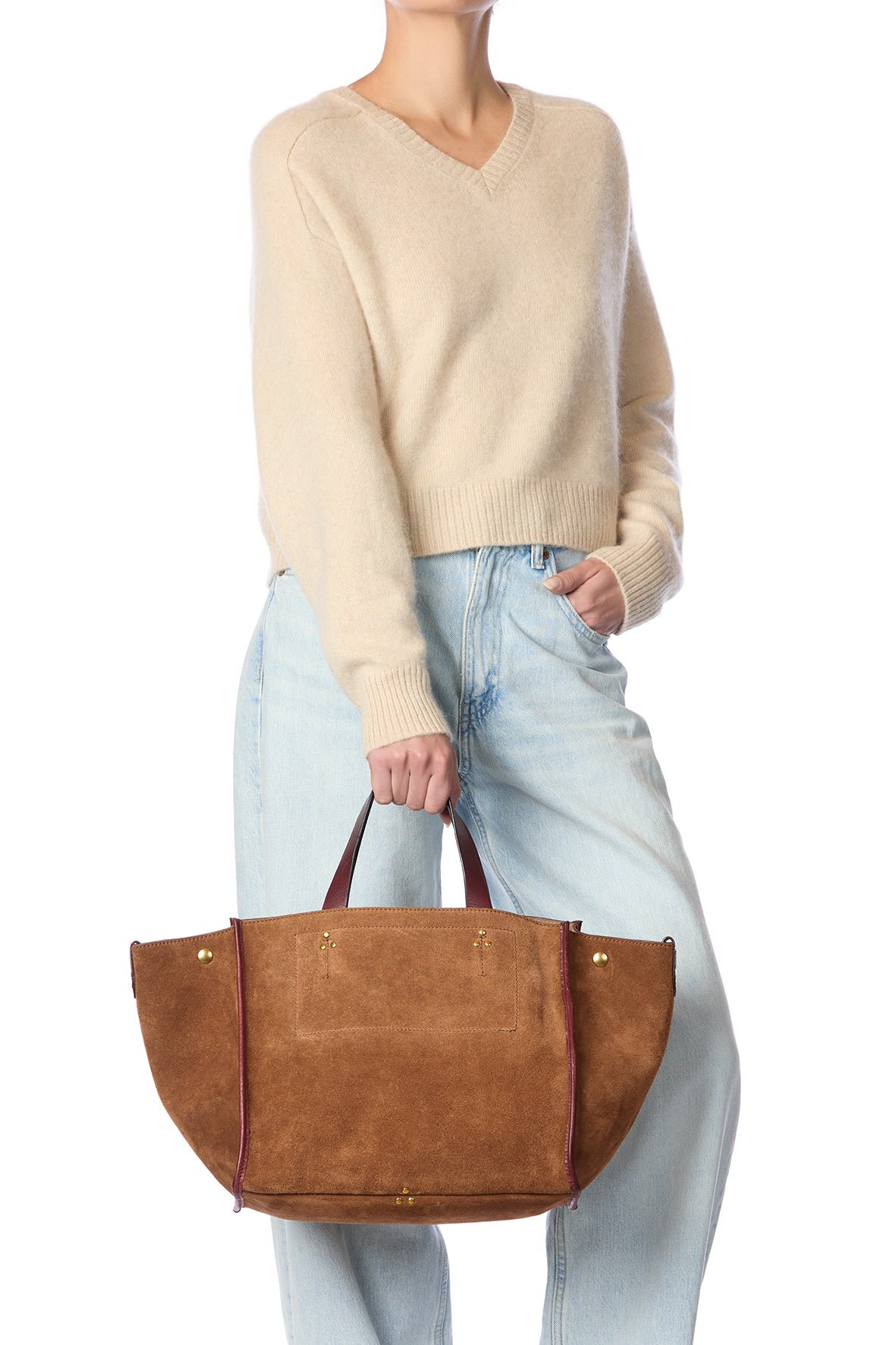 Verschluss durch Lederbänder mit Druckknopf. Vier Henkel in zwei Längen, aus Leder, am oberen Taschenrand angesetzt. Tasche mit einem großen Innenfach und einer Ledertasche, der mit einem Band innen befestigt ist.