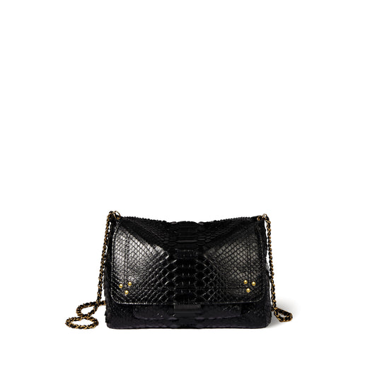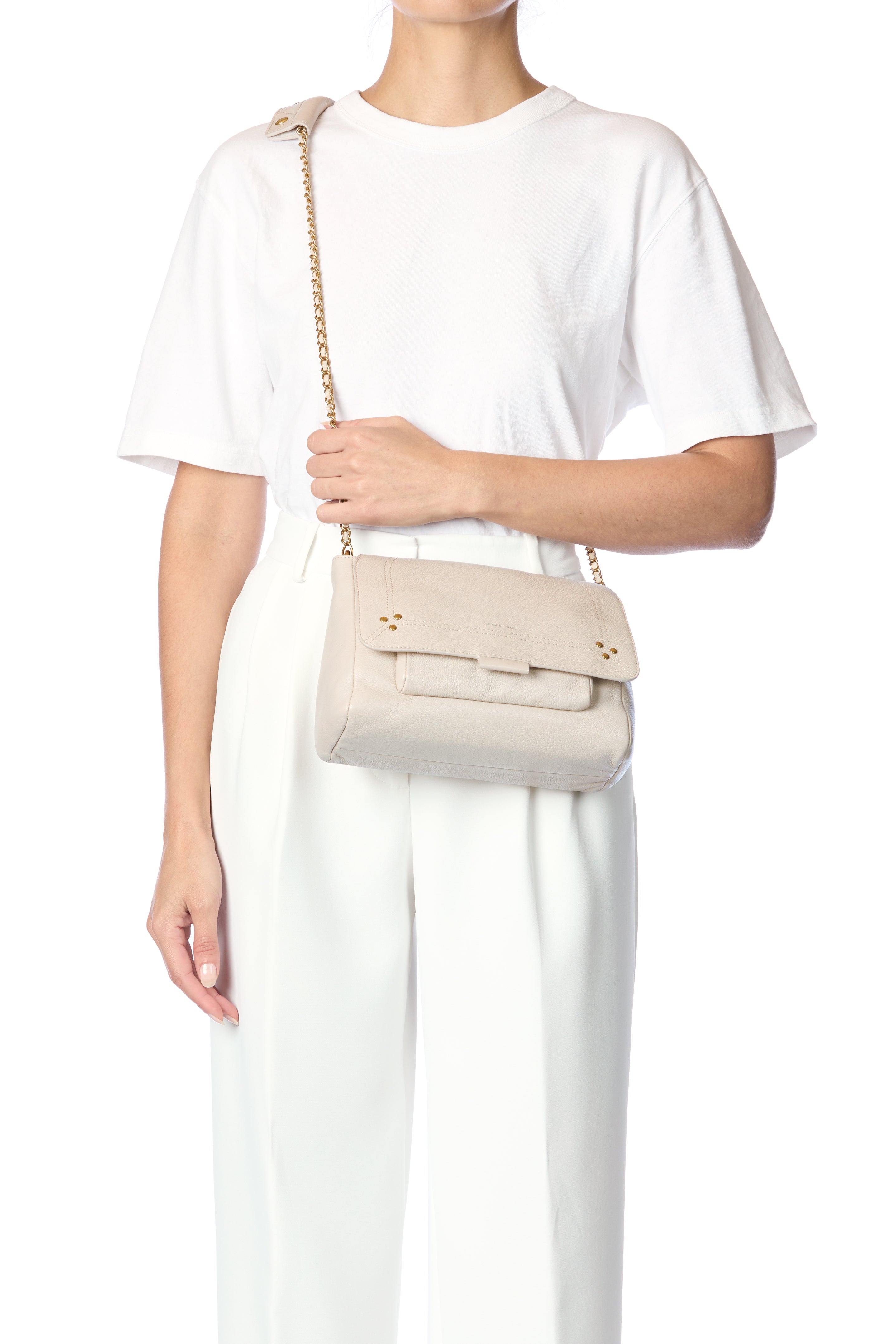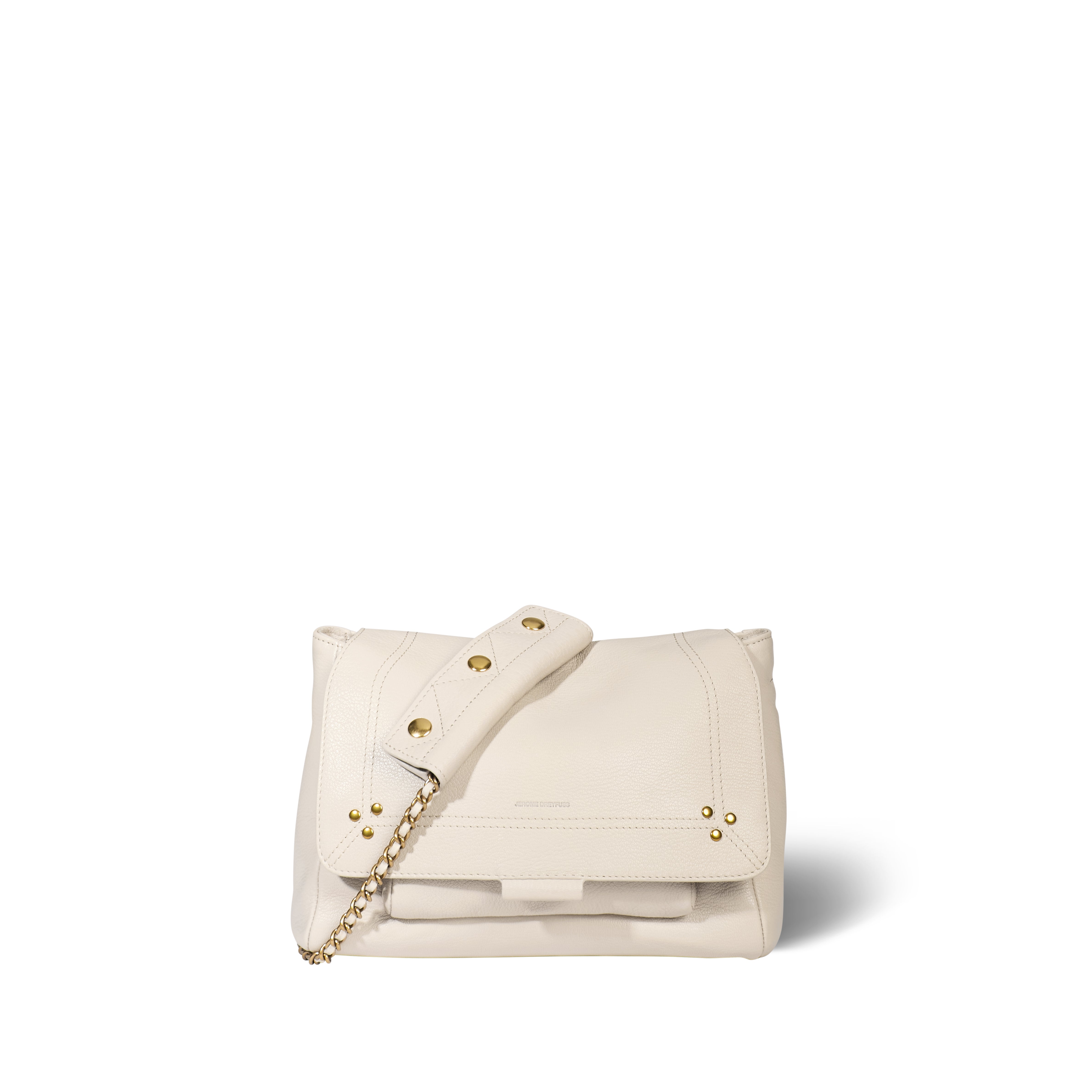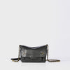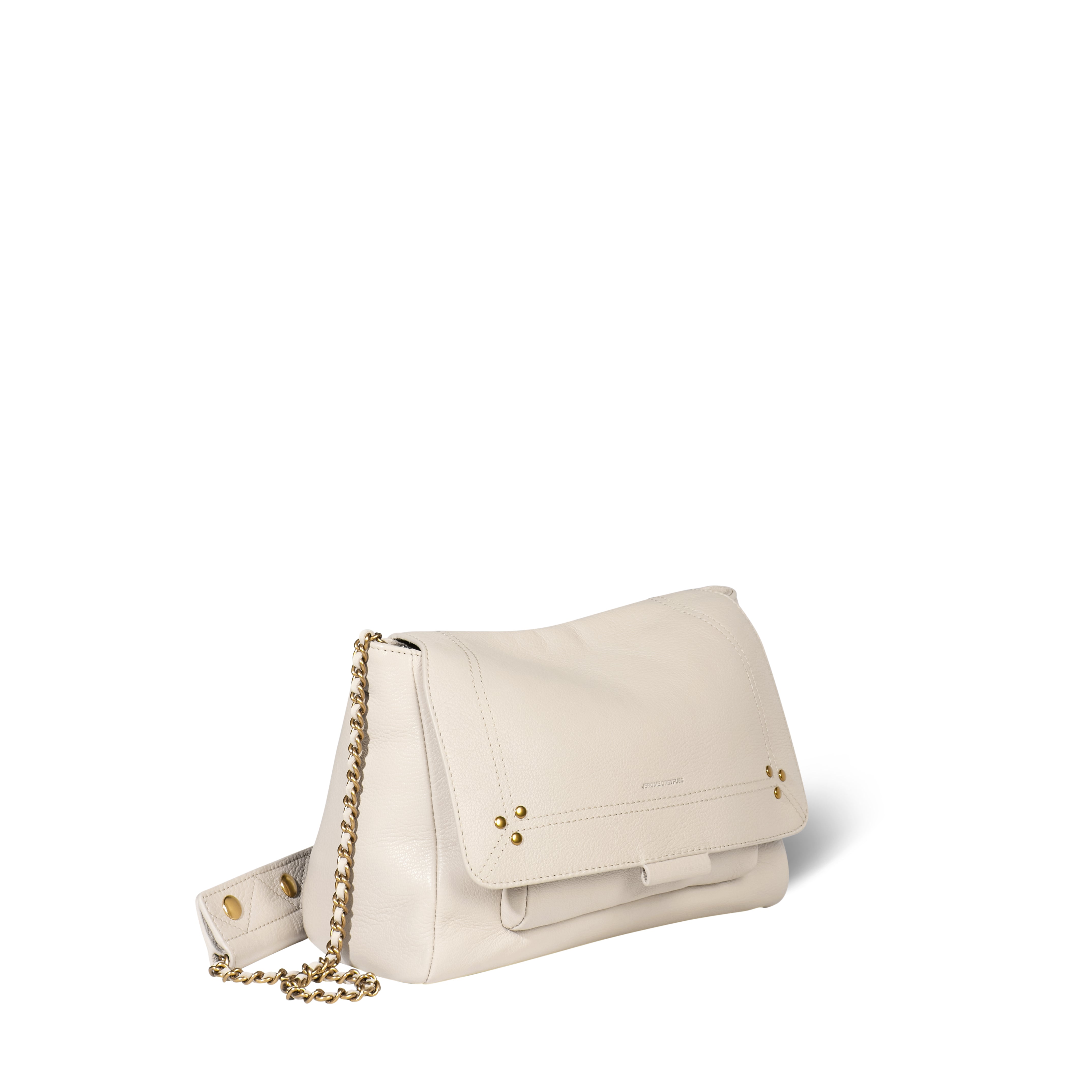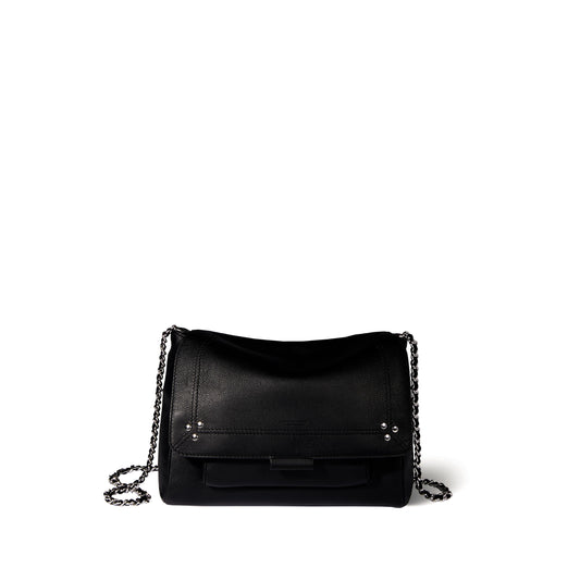 Adjustable chain and leather shoulder strap measuring 105 cm. Wide leg shoulder belt. Flap with snap button closure. One small pocket under the flap. One exterior zipped pocket. One interior pocket. One key hook inside.