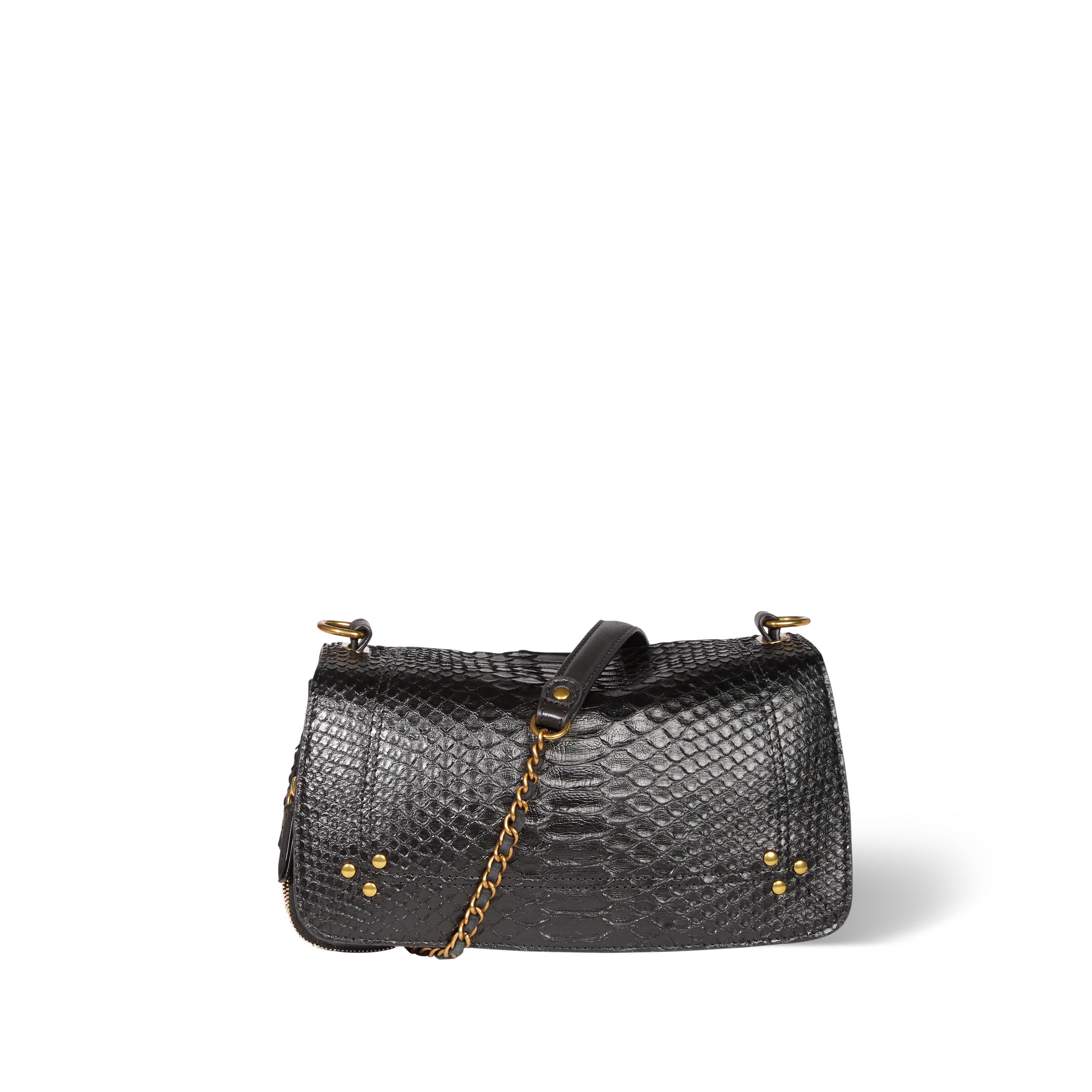 Leather and chain shoulder strap adjustable and two lengths : 65 cm or 105 cm. Leather flap with a double magnetic fastening. Three pouch compartments. Two zip gussets to adjust size. One detachable mirror and key hook inside. Can be associated with all our shoulder straps and handles Handbag 100% Goatskin / Lining 100% Cotton Dimensions : 25 x 15 x 10 cm
