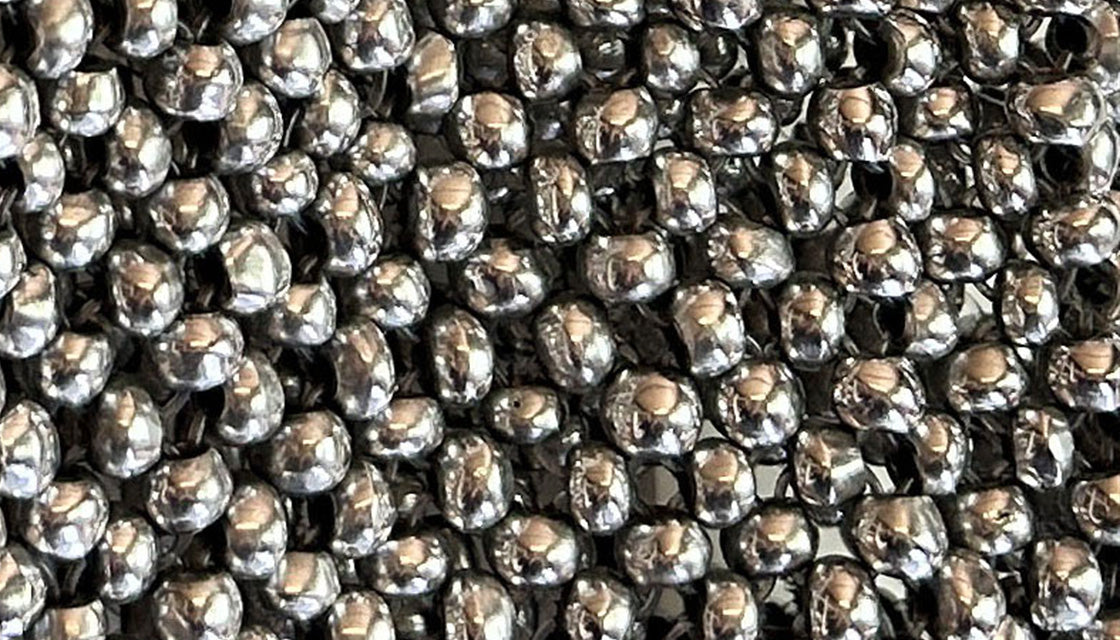 Tote bag en perles argentées qui se porte à l'épaule ou à la main. Deux poignées en cuir sur le haut du sac. Non doublé. Tressé à la main à Madagascar.